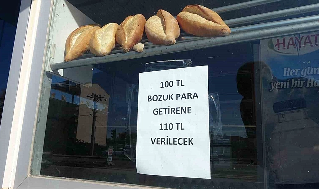 Yozgat'ta bir fırıncı, müşterilerine bozuk para üstü verecek madeni para bulamayınca dükkanının camına ilan asarak 100 lira bozuk para getirene 110 lira vereceğini söyledi.