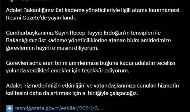 Adalet Bakanlığının üst kademe yöneticileriyle ilgili atama kararnamesi Resmi Gazete'de yayımlandı. Resmi Gazete'de yayımlanan Adalet Bakanlığı üst kademe yöneticileriyle ilgili atama kararları, "Teftiş Kurulu Başkanı Cihan Yıldız, Ceza İşleri Genel Müdürü Mehmet Yılmaz, Hukuk İşleri Genel Müdürü Hakan Öztatar, Mevzuat Genel Müdürü Mehmet Ökmen, Ceza ve Tevkifevleri Genel Müdürü Enis Yavuz Yıldırım, Adli Sicil ve İstatistik Genel Müdürü Günay Albayrak, Dış İlişkiler ve Avrupa Birliği Genel Müdürü Ömer Serdar Atabey, Personel Genel Müdürü Turan Kuloğlu, Hukuk Hizmetleri Genel Müdürü Serdar Ateş, Bilgi İşlem Genel Müdürü Servet Gül, Strateji Geliştirme Başkanı Tahir Hırslı, İnsan Hakları Dairesi Başkanı Abdullah Aydın ve İcra İşleri Daire Başkanı Hasan Özçelik" şeklinde açıklındı.