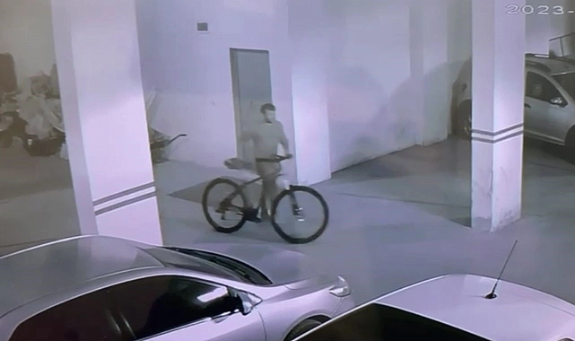 Aksaray'da bir apartmanın otoparkından bisiklet çalan şüpheli önce güvenlik kamerasına, sonra da polise yakalandı.