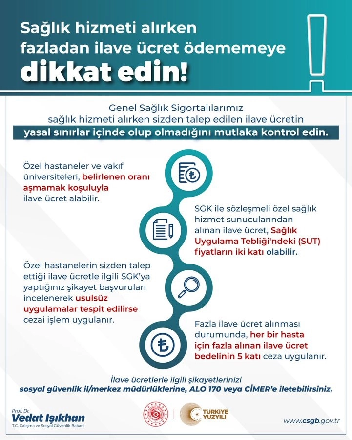 Çalışma ve Sosyal Güvenlik Bakanı Vedat Işıkhan, sosyal medya hesabından yaptığı açıklamada, Genel Sağlık Sigortalı vatandaşların sağlık hizmeti alırken talep edilen ilave ücretin yasal sınırlar içinde olması gerektiğine vurgu yaptı. Işıkhan, konuya ilişkin Sosyal Güvenlik Kurumu'nun (SGK) hassasiyetle hareket ettiğini ve tespit edilen usulsüzlüklere cezai işlem uygulandığını dile getirdi. Işıkhan, SGK ile anlaşmalı özel sağlık hizmet sunucuları tarafından alınan ilave ücretin SUT kapsamını aşması durumunda vatandaşların şikayet başvurularını Sosyal Güvenlik İl/Merkez Müdürlükleri, ALO 170 ve CiMER üzerinden yapmalarını talep ettiklerini belirterek, "Bakanlık olarak konuyu hassasiyetle takip ediyoruz" ifadelerini kullandı.