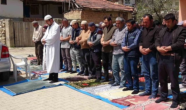 Yozgat'ın Kadışehri ilçesine bağlı Yelten köyünde depremde hasar gören caminin cemaati, cuma namazını köy meydanında kıldı.