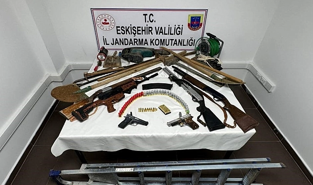 Eskişehir'de, tarihi eser bulmak için evlerinin bahçesinde kaçak kazı yapan 2 kişi, av tüfeği, tabanca ve mühimmatlarının yanı sıra çok miktarda malzemelerle birlikte yakalandı. Jandarma, Eskişehir Alpu ilçesinde tarihi eser bulmak amacı ile kaçak kazı yapılacağı bilgisi aldı. Eskişehir İl Jandarma Komutanlığına bağlı birimlerin çalışması neticesinde 2 şüpheli şahıs, evlerinin bahçesinde kaçak kazı yaparken suçüstü yakalandı. Kazı alanında 4 adet ruhsatsız av tüfeği, 2 adet ruhsatsız tabanca, 110 adet tabanca ve av fişeği, 1 adet hilti, 30 metre elektrik kablosu, kazma ve kürekler ele geçirildi. Şüpheli şahıslar hakkında "2863 Sayılı Kültür ve Tabiat Varlıklarını Koruma Kanununa Muhalefet" suçundan soruşturma başlatıldı.