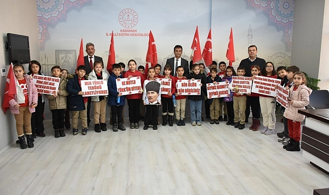 Karaman'da İlyas Küçüker İlkokulu 3-B sınıfı öğrencileri Pençe Kilit Operasyonu'nda şehit düşen 12 askeri anmak ve tüm şehitlere minnet duygularını iletmek için Karaman Şehitliğini ziyaret etti. Minik öğrenciler şehitliğe yaptıkları ziyaretinden sonra ellerinde Türk bayrakları ve 'Şehitler Ölmez Vatan Bölünmez', 'Hepimiz Mehmet'iz Hepimiz Askeriz', 'Her Türlü Terörü Lanetliyoruz' dövizleriyle İl Milli Eğitim Müdürlüğü hizmet binasına gelerek İl Milli Eğitim Müdürü Mehmet Çalışkan'ı ziyaret etti. İl Milli Eğitim Müdürü Mehmet Çalışkan, ziyaretten duyduğu memnuniyeti dile getirerek bu çalışmada yer alan idareci ve öğretmenlere teşekkür etti. Anadolu kapılarının 1071'de açıldığını hatırlatan İl Müdürü Çalışkan, "Vatan, bizim ortak paydamız, üzerinde yaşadığımız ve şehitlerimizin kanıyla sulanmış topraklardır. Bu toprakları sevmek, korumak ve daha da güçlendirmek, hepimizin sorumluluğudur" dedi. Şehitlerimiz, bu vatan uğruna canlarını feda eden kahraman insanlardır" diyerek konuşmasını sürdüren Çalışkan, "Onların aziz hatıralarını, yüreklerimizde sonsuz bir minnetle yaşatıyoruz. Bugün burada, onların emaneti olan aziz vatanımızı korumak ve geliştirmek, millet olarak ortak sorumluluğumuzdur. Aileleriniz sizi bizlere emanet etti. Biz de gelecek nesillerimizi size emanet edeceğiz. Sizler bu vatanın geleceği, umudu ve teminatısınız. Eğitim hayatınız boyunca vatanseverlik değerlerini içselleştirmeli, bilgiyle donanmalı ve ülkemizi daha ileriye taşımak için çaba sarf etmelisiniz" diye konuştu. "Şehitlerimizin hatırasına sahip çıkmak, ülkemizi daha güçlü bir geleceğe taşımanın anahtarıdır" Şehitlerimizin hatırasına sahip çıkmak, ülkemizi daha güçlü bir geleceğe taşımanın anahtarıdır." diyen İl Müdürü Mehmet Çalışkan, "Öğretmenlerinizin ve velilerimizin öğrencilerimize vatanseverlik bilincini aşılamak, onları millî ve manevi değerlerle donatarak yetiştirmek, en önemli görevlerinizden biridir. Birlik ve beraberlik içinde, sevgiyle büyüyen nesiller, daha güçlü bir Türkiye'nin temellerini atmamıza yardımcı olacaktır. Öğrencilerimizin vatanseverlik ve şehitlik kavramlarını yüreğinde hissederek, birlik ve beraberlik içinde daha güçlü yarınlara yürümeyi sürdüreceğine olan inancım tamdır. Ziyaretinizden dolayı sizlere tekrar teşekkür ediyor, vatanımız için canını veren şehadet şerbetini içen şehitlerimizi rahmet ile yâd ediyorum" şeklinde konuştu. Ziyaret İl Millî Eğitim Müdürü Mehmet Çalışkan'ın öğrencilerle günün anısına çektiği fotoğraflarla sona erdi.