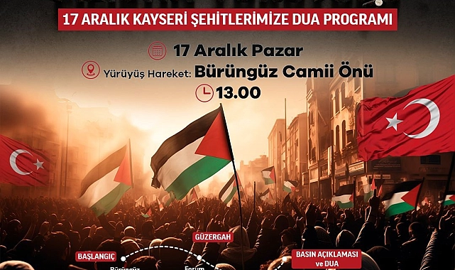 Anadolu Gençlik Derneği (AGD) Kayseri şubesi öncülüğünde düzenlenecek olan "Büyük Filistin Yürüyüşü" Pazar günü saat 13.00'te Cumhuriyet Meydanı'nda başlayacak. Anadolu Gençlik Derneği Kayseri Şube Başkanı Yusuf Şahin, "İki haftalık bir süreç içerisinde planlamalarımızı yaptık. Gerekli görüşmeleri gerçekleştirdik ve artık pazar gününü bekliyoruz. Filistin'de yaşananları gündemden düşürmeyeceğiz, normalleştirmeyeceğiz. Zalimin zulmü böyle devam edemez. Herkes bilmeli ki Filistin özgürdür. Akan kan durmadan, Filistin'in özgürlüğü kabul edilmeden bizler de durmayacağız. Kayseri bu konuda da öncülerden biri olacak. Pazar günü 'Büyük Filistin Yürüyüşü' için Kayseri'de yaşayan herkesi saat 13.00'te meydana bekliyoruz. Dünyada ses getirecek bir birliktelik için herkesi davet ediyoruz" açıklamasında bulundu. "Terörün canlı şahitleriyiz" Yusuf Şahin, "17 Aralık tarihini bilinçli olarak seçtik. Çünkü kendi ülkesinde terör faaliyetleri yaşamanın canlı şahitleriyiz. 17 Aralık'ta menfur terör saldırısı Kayserimizde başta Mehmetçiklerimize yönelik olarak gerçekleşmişti. Biz bir gün olsun onu unutmadık. Zulmün ne olduğunu bilen bizler, kendi memleketinde terör nedir yaşamış olan bizler, bomba sesini duymuş olan bizler bugün Filistin'i tahayyül etmek dahi istemiyoruz. Ancak o gün ırkçı emperyalist saldırının sorumlusu olan ülkeler bugün de Filistin'e saldırıyorlar. Ancak bizim bu pervasız akının son bulacağına inancımız tamdır. Zulüm ebedi olamaz. Zafer Filistin halkının olacaktır" dedi.