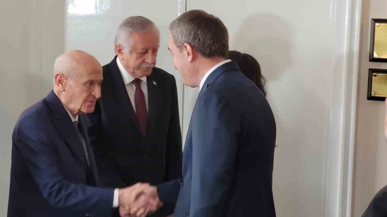MHP Genel Başkanı Devlet Bahçeli, terör örgütü PKK’nın silah bırakma ve fesih kararının ardından DEM Parti Eş Genel Başkanları Tuncer Bakırhan ve Tülay Hatimoğulları ile görüştü. Bahçeli’ye görüşmede Meclis Başkanvekili Celal Adan ve Genel Başkan Yardımcısı Feti Yıldız eşlik ederken, DEM Parti heyetinde ise Grup Başkanvekilleri Sezai Temelli ve Gülistan Kılıç Koçyiğit de yer aldı. Bahçeli, Meclisteki makamında gerçekleşen görüşmede DEM Parti heyetini kapıda karşıladı. Basına kapalı gerçekleşen görüşme yaklaşık 40 dakika sürdü. Görüşmenin ardından Bahçeli, Bakırhan ve Hatimoğulları’nı yine kapıya çıkarak uğurladı.