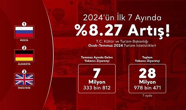 Türkiye'ye gelen yabancı ziyaretçi sayısı 2024 yılının ilk 7 ayında geçen yılın aynı dönemine göre yüzde 8,27 artarak, 28 milyon 978 bin 471 kişiye ulaştı.