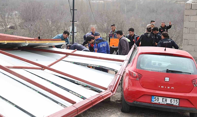 Nevşehir'de rüzgar nedeniyle bir bağ evinin çatısı savruldu. Uçan çatının altında kalan 2 kişi yaralandı. Olay merkeze bağlı Nar beldesi Aşağı Mahalle Öz mevkisinde meydana geldi. Edinilen bilgiye göre, 2 kişi sabah saatlerinde kendilerine ait olan bağ evinde çalışmaya gitti. Sac çatı üzerinde çalıştıkları esnada çıkan rüzgar, çatıyı yerinden sökerek savurdu. Savrulan çatı üzerinde bulunan iki kişi de çatının altında kalarak yaralandı. Yaralı şahısların ihbarı üzerine bölgeye sağlık, AFAD, itfaiye ve polis ekipleri sevk edildi. Yaralılar Nevşehir Belediyesi İtfaiye Müdürlüğü ve AFAD ekipleri tarafından çatının altından çıkartıldı. Yaralılardan biri polis aracıyla hastaneye sevk edilirken, diğeri ise yaklaşık 300 metre elde taşınarak ambulansa getirildi. Ambulansta ilk müdahalesi yapılan yaralı daha sonra Nevşehir Devlet Hastanesinde tedavi altına alındı. Çatı altında kalan yaralıların vücutlarında kırıklar oluşurken, olayla ilgili soruşturma başlatıldı.