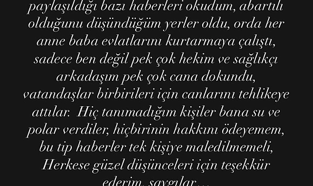 Adana'da bir özel hastanede çalışan Prof. Dr. Emre Durdağ ve eşi Doç. Dr. Gülşen Durdağ Bolu'da çıkan yangından 15 kişiyi kurtardı. Bu bilgi bir sosyal medya paylaşımıyla öğrenildi. Acil Tıp Uzmanı Dr. Sarper Sağlam'ın sosyal medya hesabından yaptığı paylaşımla Beyin ve Sinir Cerrahi Uzmanı Prof. Dr. Emre Durdağ ve eşi Kadın Hastalıkları Uzmanı Doç. Dr. Gülşen Durdağ'ın Bolu Kartalkaya'da çıkan otel yangınında orada oldukları ve yangından kurtulduktan sonra 15 kişiyi daha kurtardıklarını aktardı. Doç. Dr. Gülşen Durdağ'ın 4 metre yükseklikten düşerek bacağını kırdığı ve doktor çiftin kahramanlığı bu paylaşımla öğrenildi. Sağlam, paylaşımında şu ifadelere yer verdi: "Adana'da çalışan Beyin ve Sinir Cerrahi Prof. Dr. Emre Durdağ, eşi Kadın Hastalıkları Doğum Uzmanı Doç. Dr. Gülşen Durdağ, iki çocuğu ile oteldeydi. 7. Kattaki odalarından çarşafları ip yaparak kurtuldular. Emre Bey daha önce "Dağcılık" eğitimi almıştı. Kendi ailesi ile birlikte 15 kişiyi kurtardı. Bunlar içinde çarşaf iple indirilen 5 yaşındaki bir çocuk da vardı. 14. sırada eşini indirmeye çalışırken ip koptu ve Gülten Hanım 4 metreden düştü ve bacağı kırıldı. Hastanede ziyaret etti. Dr. Emre artık inecek çarşaf ipin bile olmadığı bir durumda pencereyi açarak karbonmonoksit zehirlenmesinden korundu. Yetişen itfaiyenin merdiveni ile sonunda kurtuldu. İkisi de kahraman! Kutluyoruz." "Bu tip haberler tek kişiye mal edilmemeli" Paylaşımın sosyal medyada büyük ilgi görmesinin ardından Beyin ve Sinir Cerrahi Prof. Dr. Emre Durdağ, bir paylaşımda bulunarak, "Değerli tanıdıklar; takipçiler; ismimin paylaşıldığı bazı haberleri okudum, abartılı olduğunu düşündüğüm yerler oldu, orda her anne baba evlatlarını kurtarmaya çalıştı, sadece ben değil pek çok hekim ve sağlıkçı arkadaşım pek çok cana dokundu, vatandaşlar birbirileri için canlarını tehlikeye attılar: Hiç tanımadığım kişiler bana su ve polar verdiler, hiçbirinin hakkını ödeyemem, bu tip haberler tek kişiye mal edilmemeli. Herkese güzel düşünceleri için teşekkür ederim, saygılar" ifadelerini kullandı.
